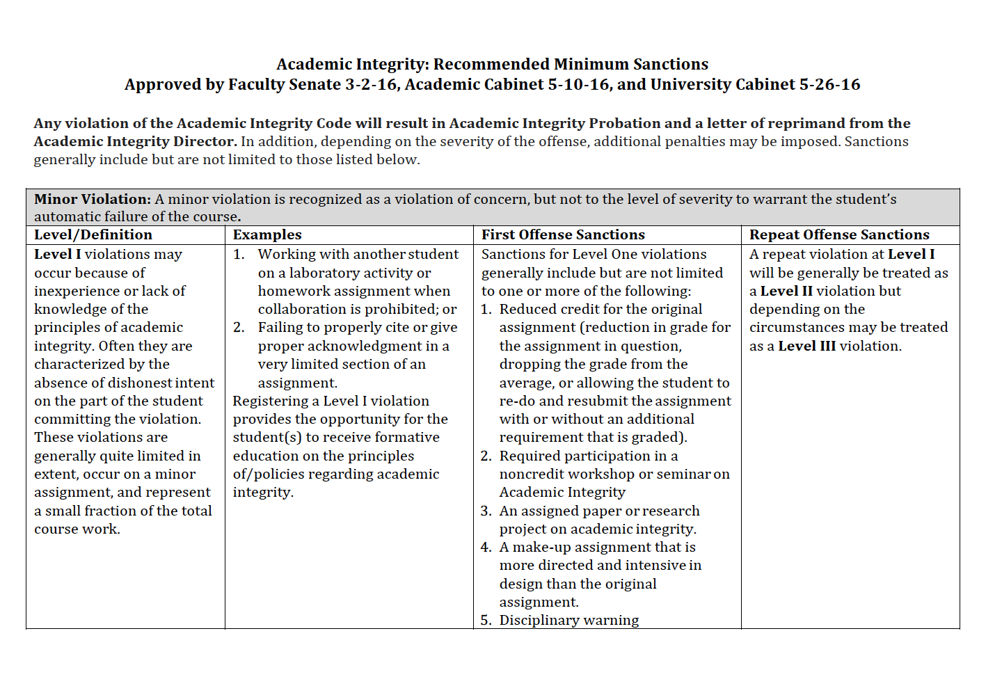 - Academic Integrity: Recommended Minimum Sanctions