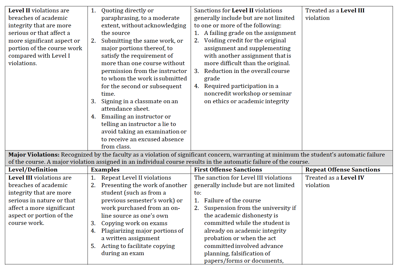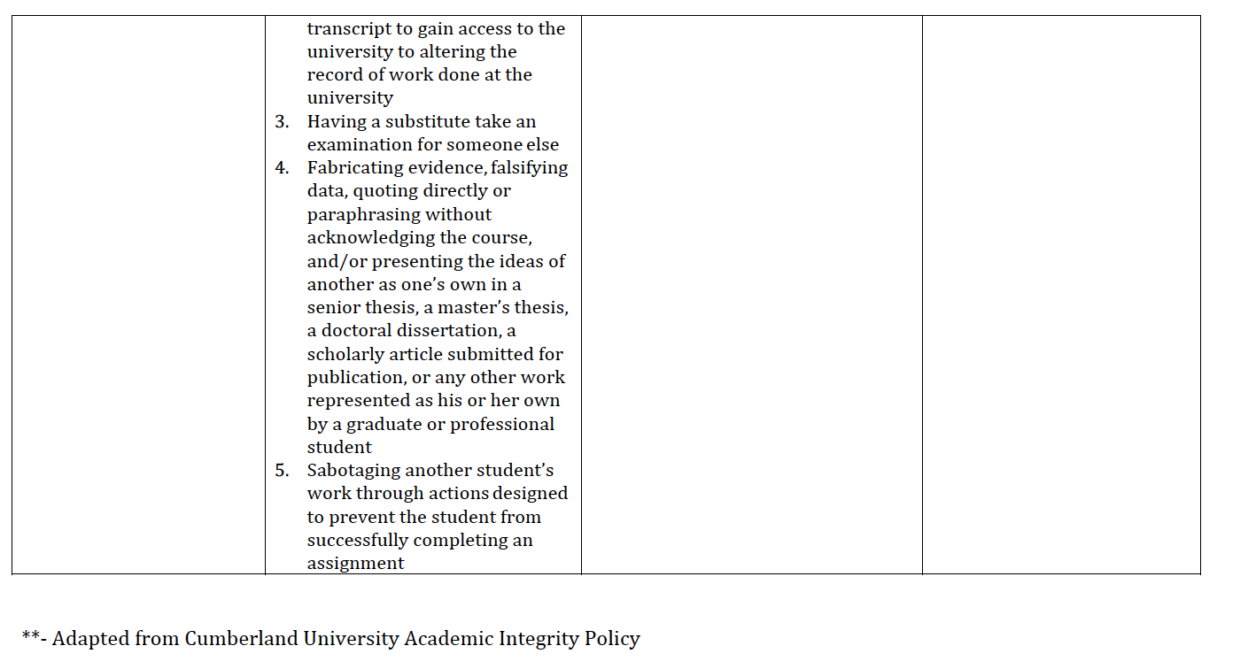 - Withholding information: Failure to inform Academic Integrity Representative(s), the Academic Integrity Hearing Board or faculty members of any and all information concerning academic integrity code violations.
